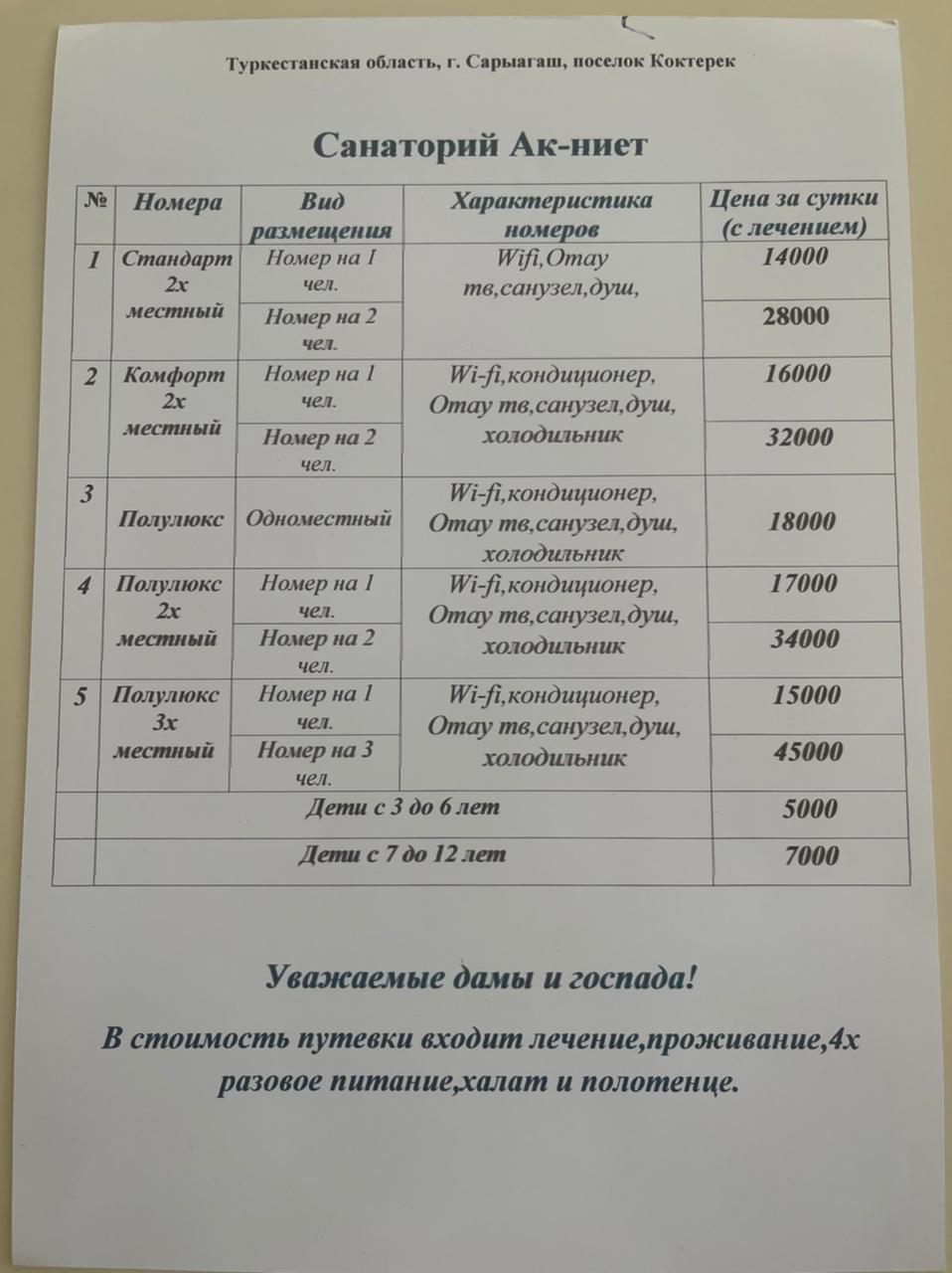 Санаторий Ак ниет расположен в экологически чистой, тихой зоне и находится в 5 км от райцентра Мерке на окраине поселка Ойтал. Прекрасный климат курортного района, искусственный водоем, живописная природа - незаменимые спутники хорошего отдыха. Санаторий был открыт в 2007 году и работает круглогодично в любой сезон года, лечение которого благоприятно скажется на Вашем здоровье. Санаторий рассчитан на 100 мест. Корпус санатория окружен лесопарковой зоной, состоящей из соснового бора посадок дуба, берез и многих других. Современный спальный и лечебный корпус, который расположен в одном здании, создает, не выходя на улицу, уют и комфорт. Хорошо организованный быт в сочетании с лечением (реабилитация), современными достижениями медицины способствуют быстрейшему выздоровлению пациентов. Сегодня в санатории работают высококвалифицированные врачи – физиотерапевт, невропатолог, обладающий навыками иглорефлексотерапии, акушер-гинеколог, стоматолог, помогающие людям восстановить здоровье, сделать их отдых полноценным и приятным.