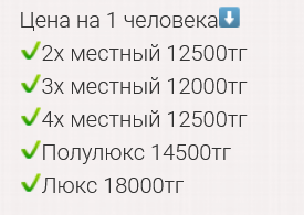Комфортные номера класса полулюкс или люкс (1-3 местные). В номерах: кондиционеры, телевизор, холодильник, санузел, WiFi, косметические принадлежности