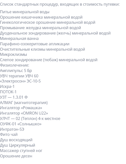 Ваша лечебная программа может быть стандартного типа, а может быть подобрана индивидуально. В зависимости от программы, Вас ждет 4-5 процедур ежедневно и курс минеральной воды